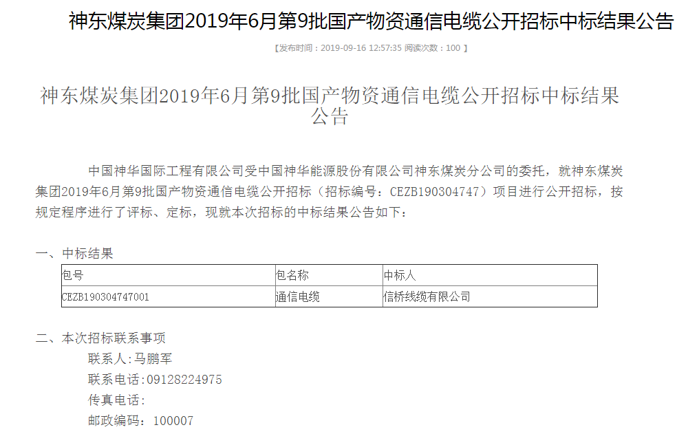 點(diǎn)擊數(shù):58762019-11-21 00:00:00 來源: 神東煤炭集團(tuán)2019年6月第9批國(guó)產(chǎn)物資通信電纜公開招標(biāo)中標(biāo)結(jié)果公告